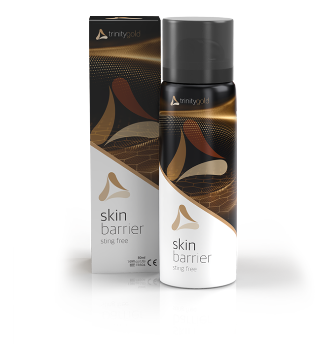 Trinity Gold Hudbarriere spray beskytter ømfintlig hud mot klebeskade ved fjerning av uridom. Den skånsomme sprayen skaper en pustende og beskyttende hinne på huden.